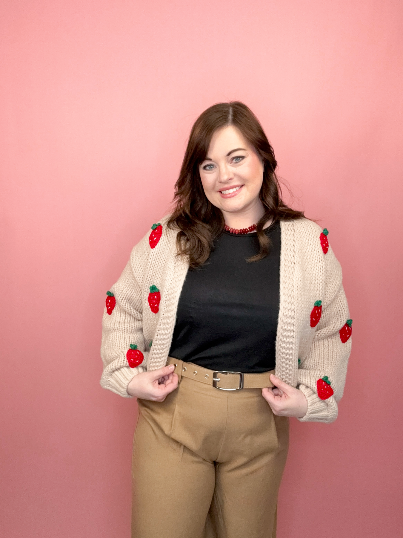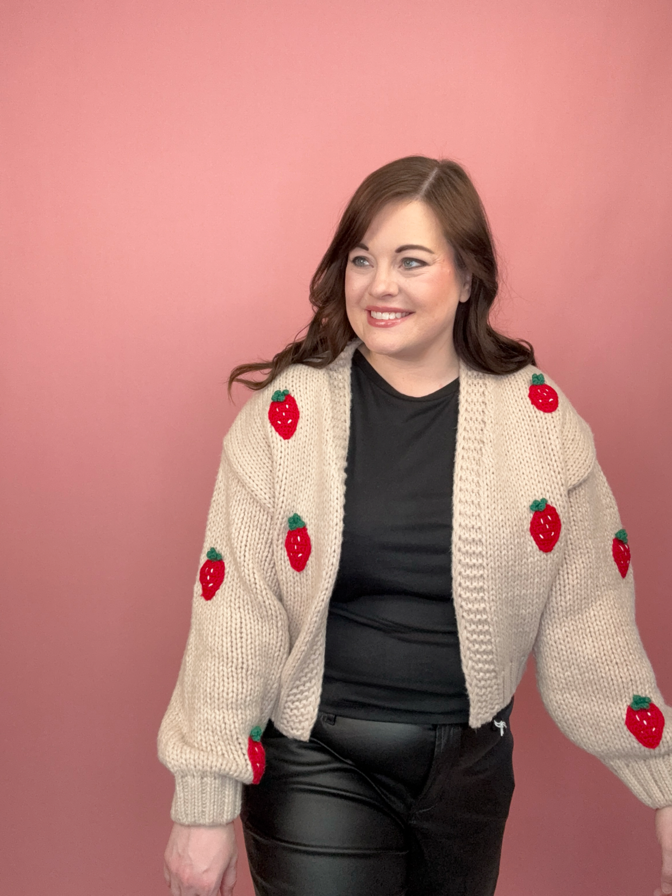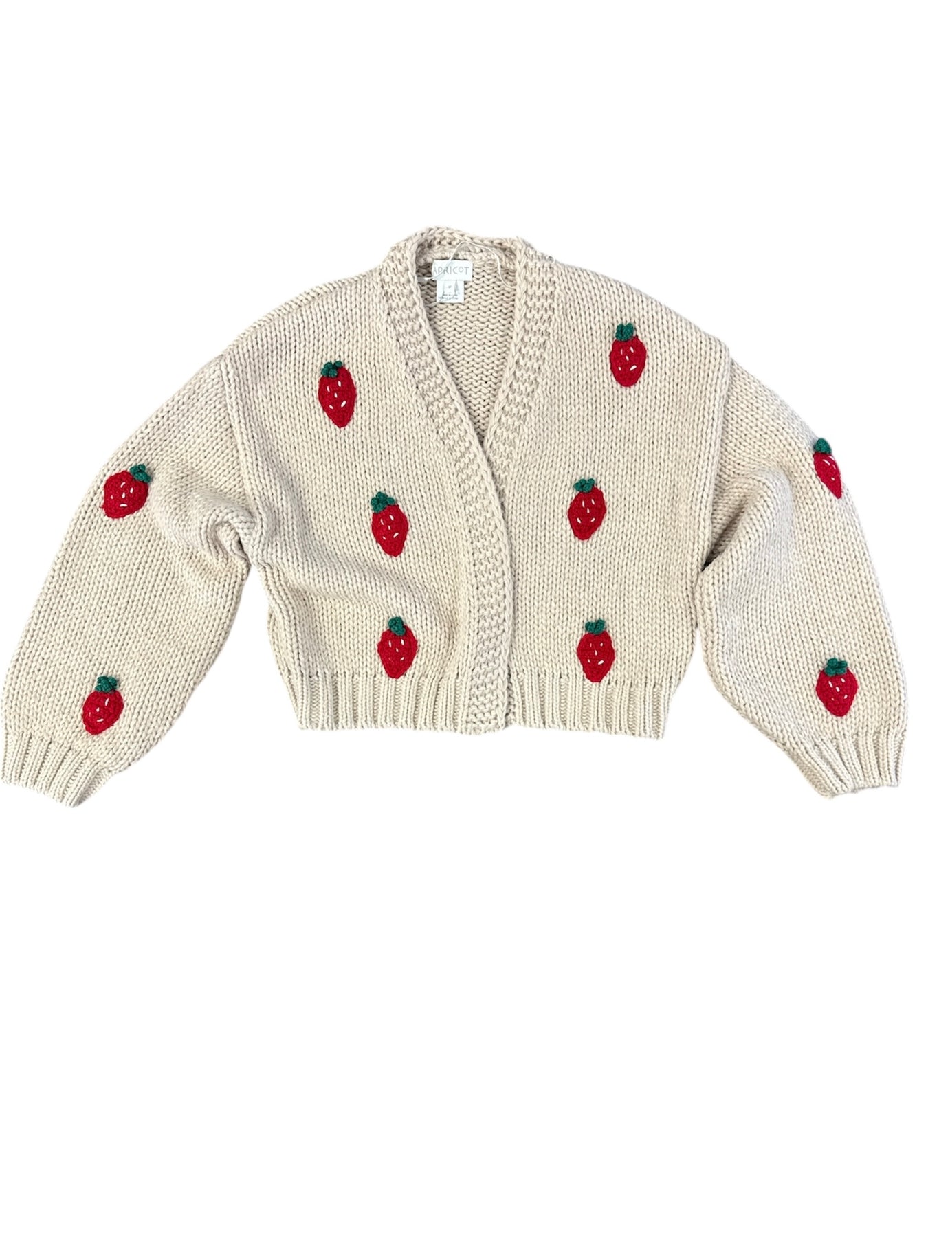 Cozy and cute, this chunky-knit cardi is the perfect cover-up on chilly days. Boasting a soft, heavyweight finish, it features a tactile 3D strawberry design, balloon sleeves, an edge-to-edge opening, and classic ribbed trims. Layer it over a printed dress and team with tights and ankle boots to complete the look.