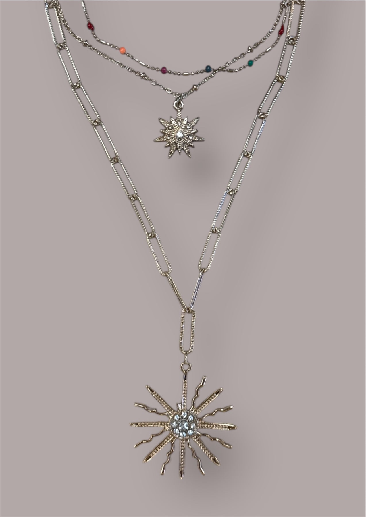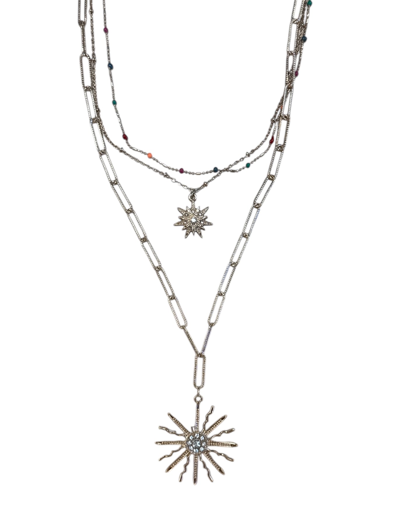 Brighten your look with this Sunburst Pendant Necklace Set featuring layered strands of gold and colorful beads. The radiant sunburst pendant adds a bold focal point, creating a vibrant statement piece that’s perfect for dressing up everyday outfits.