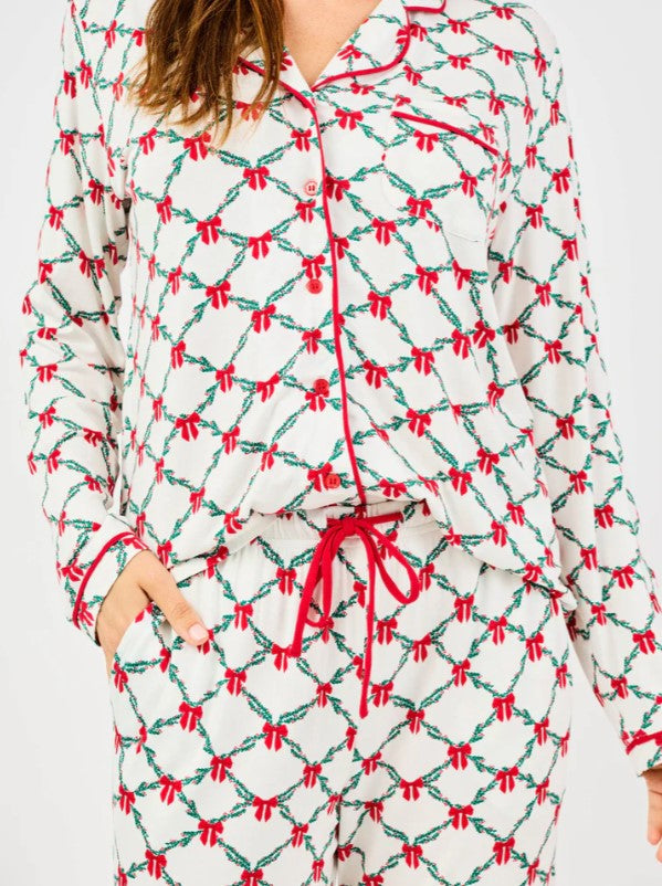 Introducing our Holiday Charlotte Pajama Set, where comfort meets festive charm. Perfect for sipping cocoa by the tree or enjoying Christmas morning in cozy style, this pajama set brings holiday cheer to every moment. Featuring a long-sleeve button-front top with a classic collar and straight-leg pants with an adjustable drawstring, our Charlotte Pajama Set combines classic holiday style with all-day comfort.