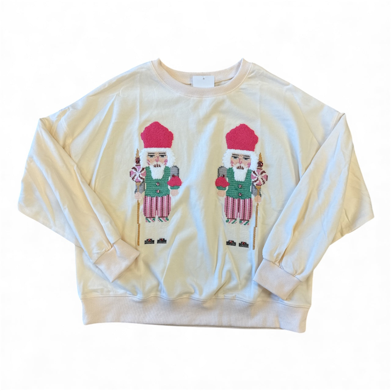Add a little sparkle to your holiday wardrobe with this festive sweatshirt featuring beautifully embroidered nutcrackers adorned with eye-catching rhinestone details. The soft, cozy fabric keeps you warm while the dazzling accents bring the perfect touch of Christmas cheer. Whether you’re heading to a holiday party or lounging by the tree, this sweatshirt is a merry must-have for the season!