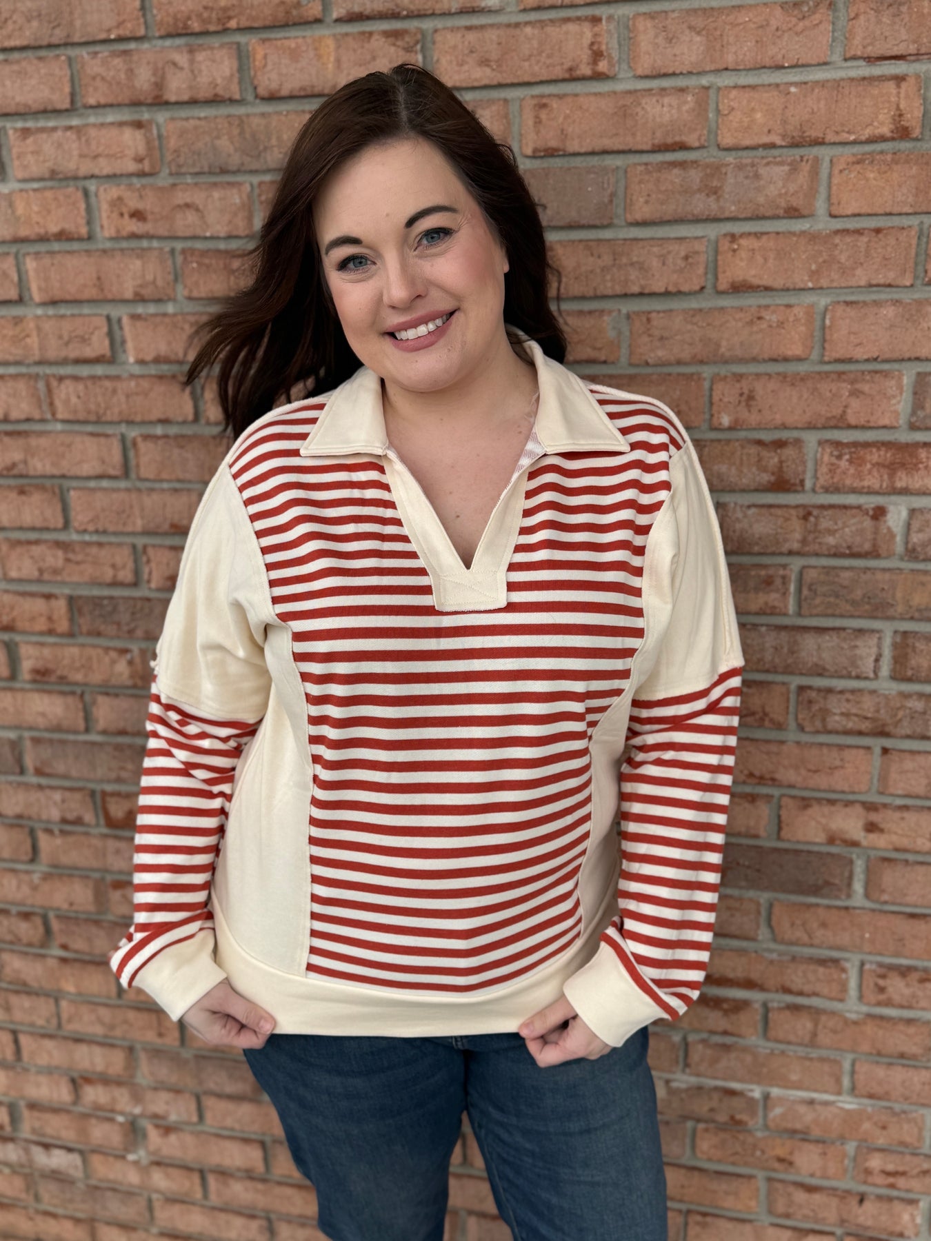 Elevate your casual look with this polo-collar, long-sleeve color-blocked terry knit top. Featuring bold stripe detailing and a soft, textured terry feel, this pullover blends comfort with a sporty, everyday vibe. The relaxed fit and classic polo neckline make it perfect for layering or wearing solo through every season. A stylish twist on a cozy essential.